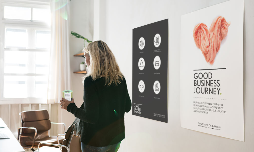 Country Road Group is one of Australia’s largest specialty fashion retailers and they on a journey to be a leader in sustainability within the fashion industry. So we helped the Country Road Group team localise their GOOD BUSINESS JOURNEY sustainability strategy for the Australian retail apparel market and bring it life.